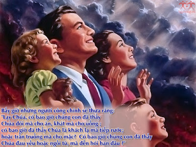 “Nào những kẻ Cha Ta chúc phúc, hãy đến thừa hưởng Vương Quốc dọn sẵn cho các ngươi ngay từ thuở tạo thiên lập địa. Vì xưa Ta đói, các ngươi đã cho ăn; Ta khát, các ngươi đã cho uống; Ta là khách lạ, các ngươi đã tiếp rước; Ta trần truồng, các ngươi đã cho mặc; Ta đau yếu, các ngươi đã thăm nom; Ta ngồi tù, các ngươi đã đến thăm.”