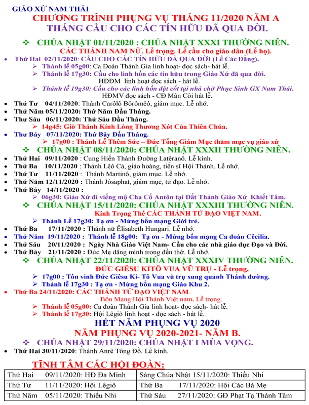 LỊCH PHỤNG VỤ THÁNG 11/2020
